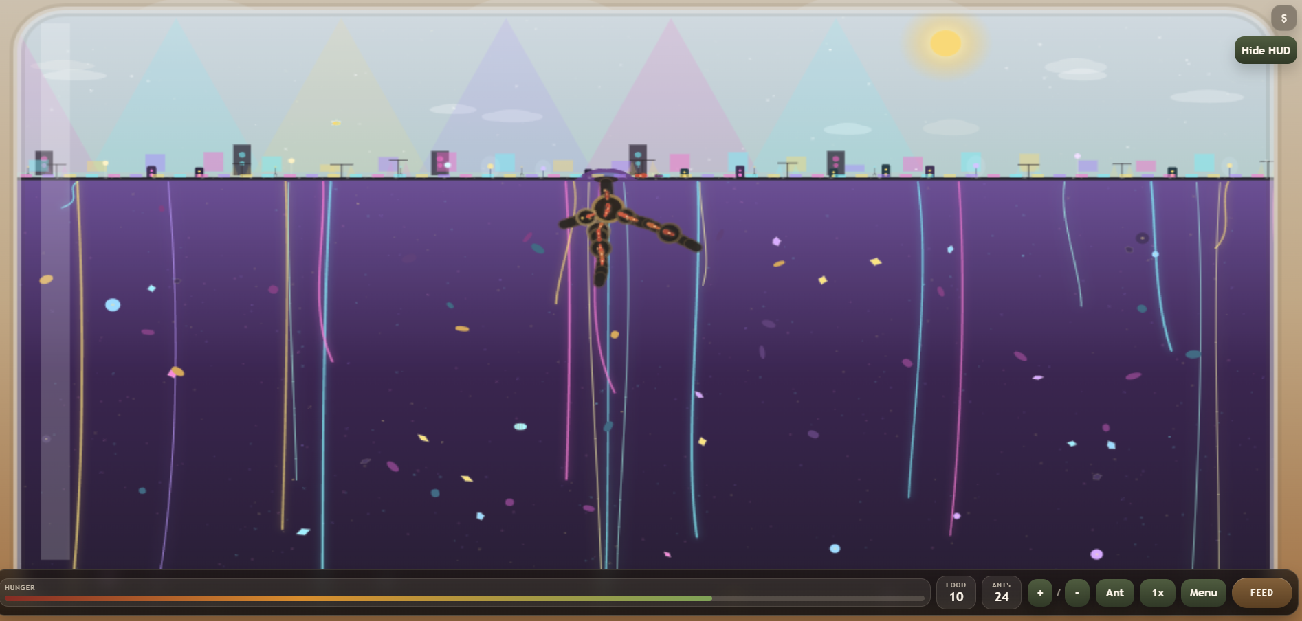Live controls: use FEED as an emergency drop with a long cooldown, tap surface bugs, underground bugs, carcasses, and tunnel invaders for extra food, and use +, -, and Ant to zoom and follow a random worker.